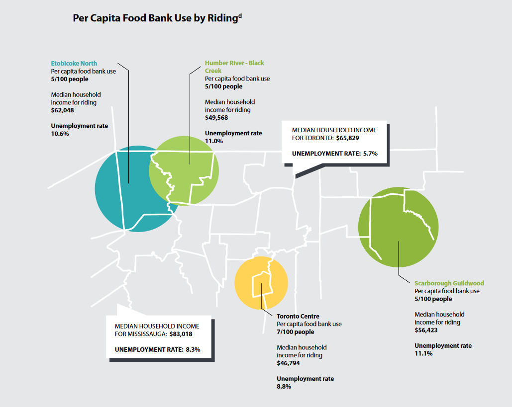 These same communities are also the most likely to experience food insecurity. The 2019 Who’s Hungry report from the Daily Bread Food Bank found food bank use in the city was far more concentrated in these regions than in the more affluent (and now more vaccinated) parts of Toronto.